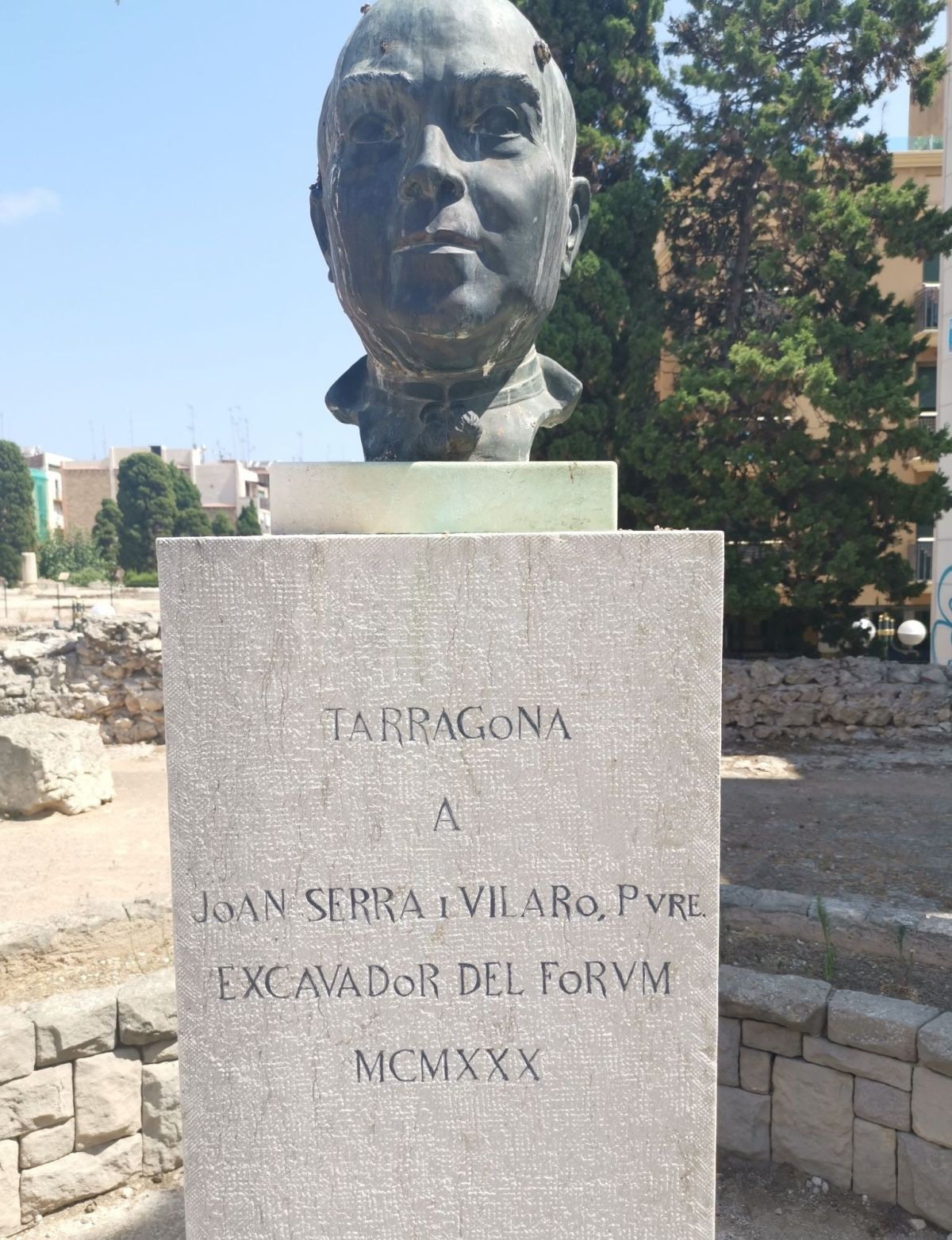 En el recinto del Foro Colonial de Tarraco se alzaba la escultura dedicada a Joan Serra i Vilaró, uno de los arqueólogos fundamentales para la recuperación y el estudio del pasado romano de Tarragona. El monumento funcionaba como puente entre dos tiempos. Frente a los basamentos de columnas y los restos de muros, la escultura recordaba que el patrimonio no solo sobrevive por azar, sino gracias al trabajo paciente de quienes lo investigan y protegen.