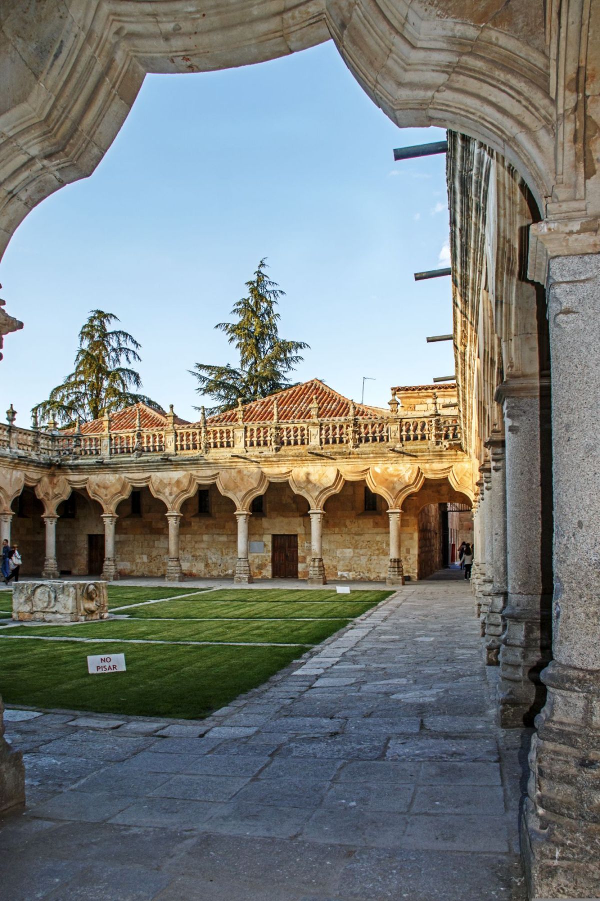 穿过银匠式立面,便进入学校的内庭院。这是一处庄严而静谧的空间,四周环绕着多座历史悠久的建筑,包括大学院(Escuelas Mayores)、小学院(Escuelas Menores)以及学生医院(Hospital del Estudio)。宽敞的庭院使人得以静心欣赏这些建筑瑰宝:温润的金色石墙、精致的纹章、整齐的阳台,以及丰富而细腻的文艺复兴时期装饰细节。踏足这里仿佛是过去与现在的交汇点。学生在此学习求知,游客则循着建筑与历史的脉络,追寻昔日的记忆。
