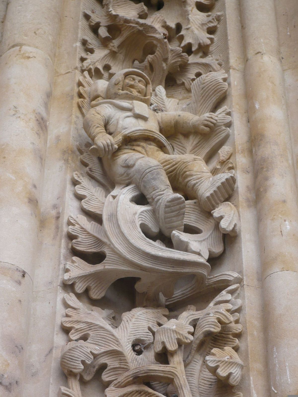 最吸引我注意的是,教堂中竟出现了一些看似现代的人物形象,例如图中这位著名的宇航员。这座雕塑位于拉莫斯门廊,乍一看,一位头戴头盔、身穿宇航服、脚蹬宇航靴的宇航员,竟以石雕的形式出现在哥特式与文艺复兴风格的浮雕之中。许多人对此感到费解,但这位“宇航员”实际上并非教堂最初建造时的装饰,而是1992年修复工程中新添的。石匠们遵循中世纪传统,将代表当代时代的元素巧妙融入古老建筑,使历史与现代在此奇妙地交汇。